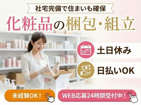 化粧品の梱包・組立/社宅完備で住まいも確保/土日休み