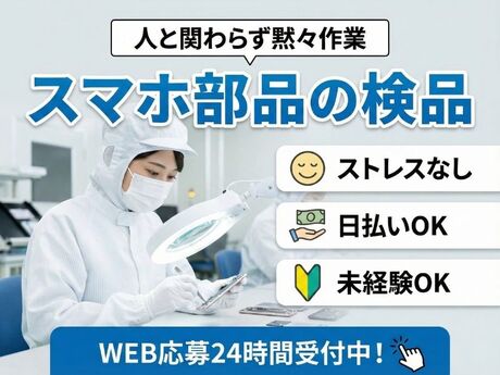 □ 人間関係のストレスなし・黙々と進める作業中心・過度なコミュニケーション不要・自分のペースで働ける□ 軽作業でラクに続けやすいスマホ部品の検品・仕分け / 未経験スタート多数□ 働きやすさ重視落ち着いた職場環境
