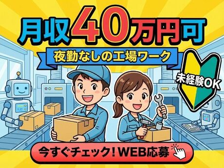 ● 日勤のみで高収入昼間だけの勤務で月40万円を目指せる / 夜勤なし / 生活リズム安定● 未経験OK工場勤務が初めてでも安心 / 覚えやすい作業中心● 働きやすさ重視落ち着いた職場環境 / 長期勤務向き